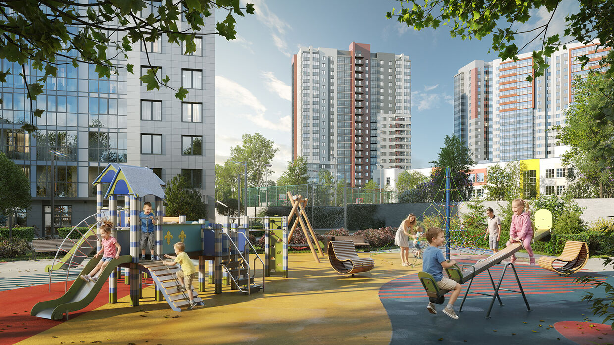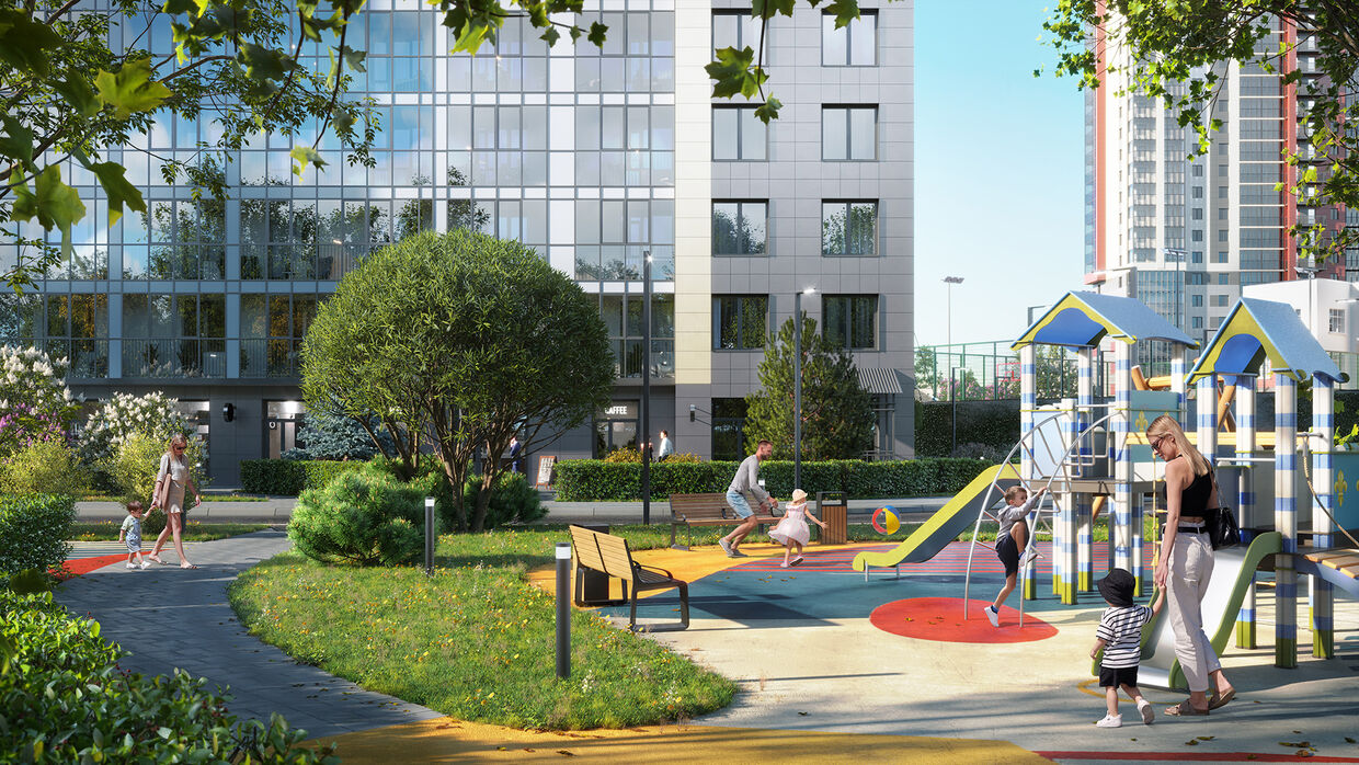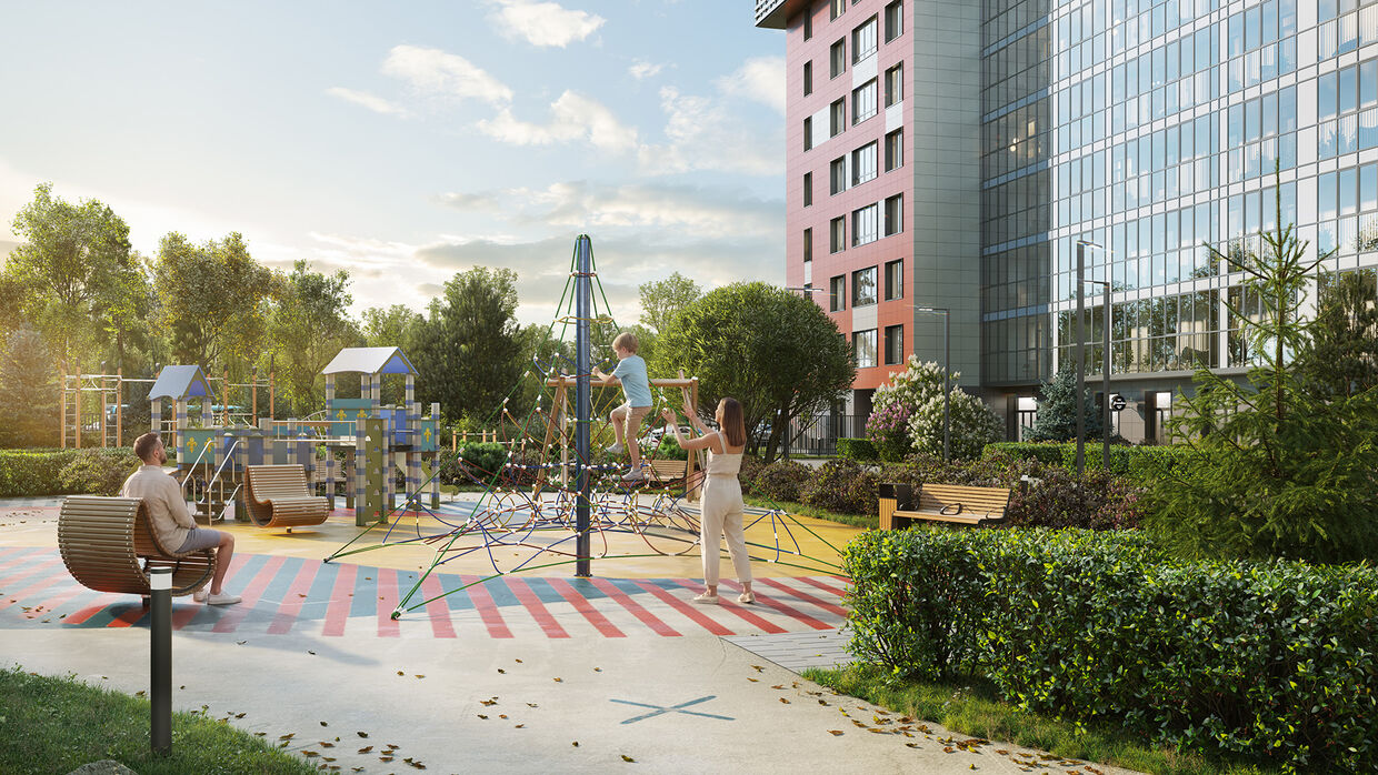 Для жителей организовано закрытое дворовое пространство с детскими и спортивными площадками, а также зонами для отдыха.
